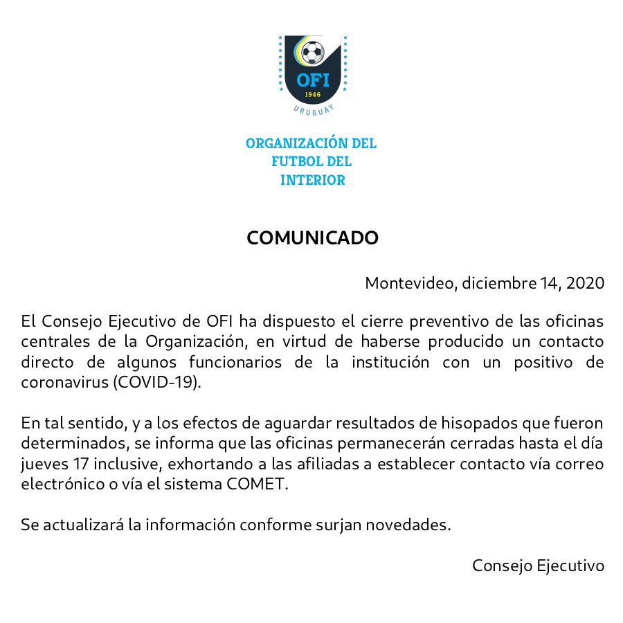 El Consejo Ejecutivo de la Organización del Fútbol del Interior (OFI) dispuso este lunes el cierre preventivo de las oficinas centrales de la organización, hasta el jueves 17 inclusive, en virtud de "haberse producido un contacto directo de algunos funcionarios de la institución con un positivo de coronavirus", indicaron en un comunicado.
