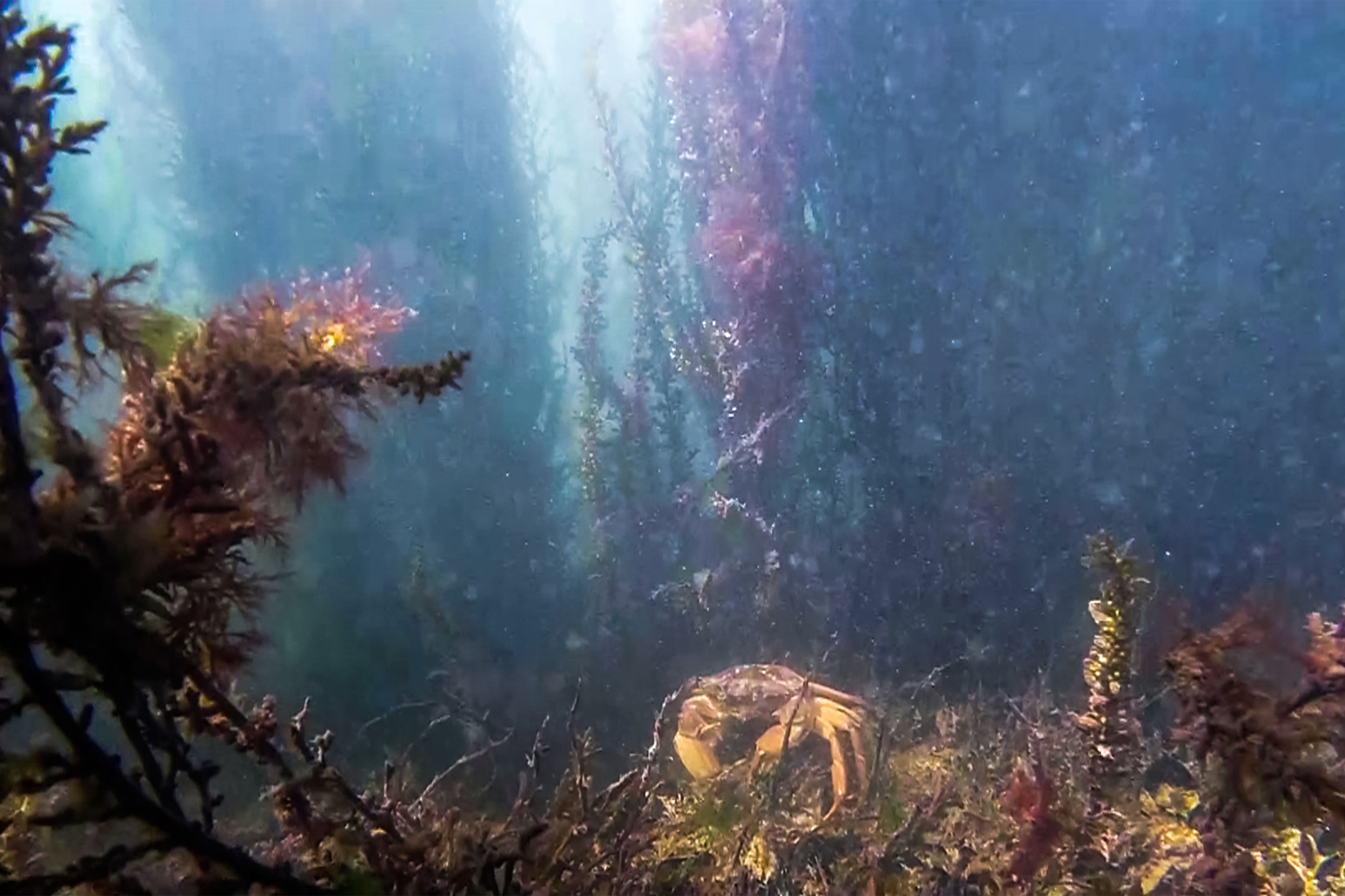Un cangrejo intenta atrapar con sus pinzas a este intruso indiscreto, las medusas emergen a ras de la superficie mientras bancos de peces pasan tranquilamente por debajo, los moluscos se aferran a los famosos pilotes de la Serenísima y las algas de todos los colores se balancean a merced de la corriente.